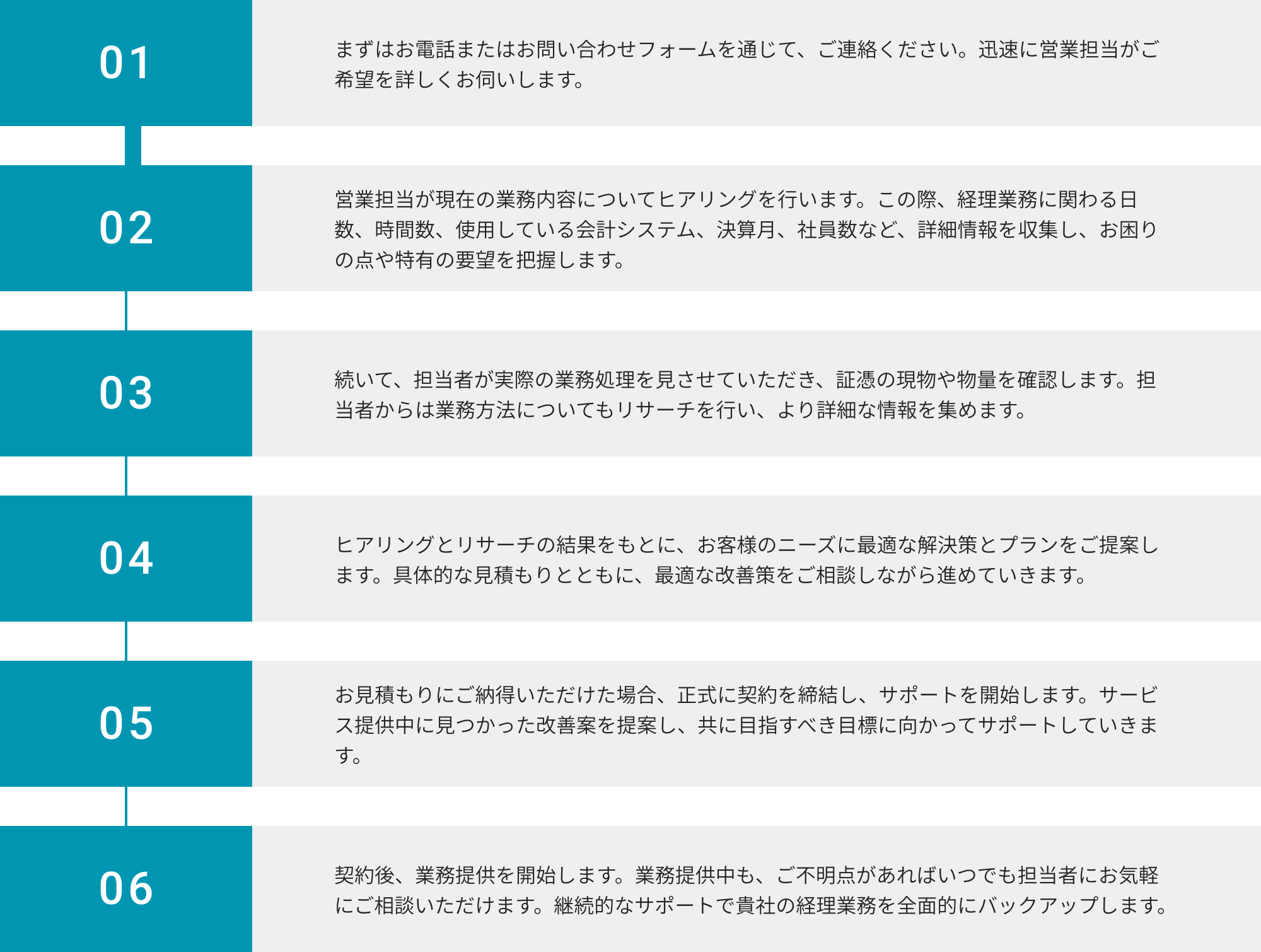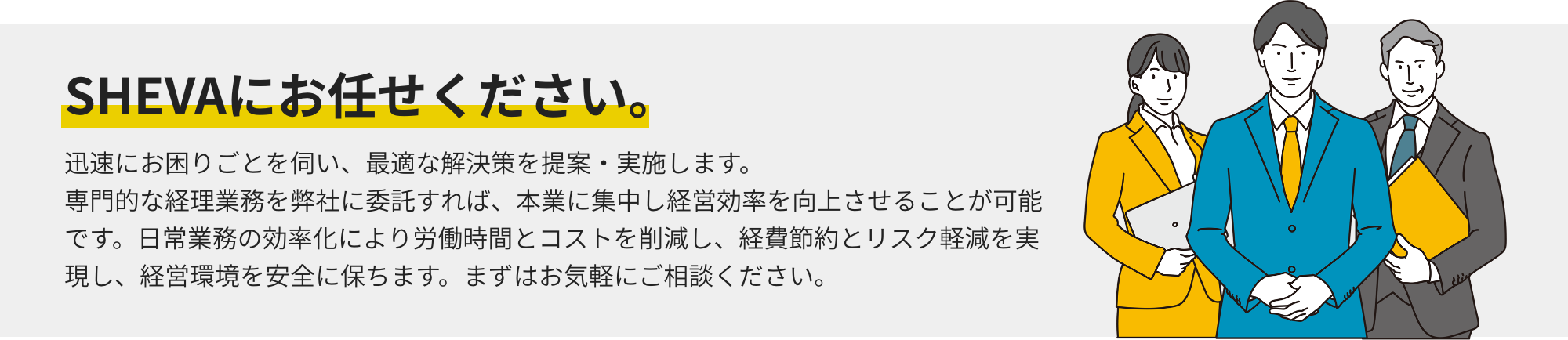 ご相談だけでも大歓迎。お気軽にお問い合わせください。【平日】9:00~17:00 【土日祝日】定休日 ご相談だけでも大歓迎。お気軽にお問い合わせください。 【平日】9:00~17:00 【土日祝日】定休日 PROBLEM こんなお悩みありませんか? 急な事務員の退職や休暇で業務が滞っている。人手が足りない。負担が限界だ。 経理にかかる時間と労力が大きな負担。どうにかこの状況を改善できないものか。 経理が苦手で毎日が苦痛。専門知識不足で不安が大きい。 紙の書類が山積みでデジタル化への移行が思うように進まない…。 SHEVAにお任せください! SHEVAはあなたのお悩みを解決いたします。 SHEVAにお任せください! SHEVAはあなたのお悩みを解決いたします。 STRENGTH 当社の強み 国税局OBの税理士・プライム上場企業経理経験者が在籍しているため、強固な体制でお客様をサポートいたします。 AI-OCRシステムを導入しているため、迅速かつ正確な会計処理を提供いたします。 当社はお客様を第一に考え、リーズナブルな価格で対応いたします。 お困りごとがある場合もない場合も、まずはお気軽にご相談ください。 ご連絡いただければ、まずは御社の状況をお聞きした上で、具体的な解決策を提示いたします。 ご提案にご満足いただけたら、正式なご契約を経てさまざまな改善案をご提供しながら、共に伴走させていただきます。 どんな小さなご相談でも歓迎ですので、ぜひ一度お問い合わせください。 ご相談だけでも大歓迎。お気軽にお問い合わせください。【平日】9:00~17:00 【土日祝日】定休日 ご相談だけでも大歓迎。お気軽にお問い合わせください。 【平日】9:00~17:00 【土日祝日】定休日 CASE 導入事例 急速な事業拡大により経理業務の負担が増加していました。特に請求書の処理と月次決算が追いつかない状況でした。経理業務を委託したことで経理業務の時間削減に成功し、開発と顧客サービスに集中できるようになり業績は前年比で50%向上しました。 売上の記録や仕入れの管理を手作業で行っており、効率が悪く大きな負担になっていました。そこで経理業務を委託。作業にかかる時間が大幅削減され、お店は料理の品質向上や顧客サービスに注力できるようになりました。 経理担当者が不在で、全ての会計業務が不慣れな従業員が経理を兼業しており、従業員の残業が日常化していました。経理業務を委託したところ財務管理の効率が向上。従業員は本来の業務に集中でき、日常化していた残業を減らすことができました。 CASE 導入事例 急速な事業拡大により経理業務の負担が増加していました。特に請求書の処理と月次決算が追いつかない状況でした。経理業務を委託したことで経理業務の時間削減に成功し、開発と顧客サービスに集中できるようになり業績は前年比で50%向上しました。 売上の記録や仕入れの管理を手作業で行っており、効率が悪く大きな負担になっていました。そこで経理業務を委託。作業にかかる時間が大幅削減され、お店は料理の品質向上や顧客サービスに注力できるようになりました。 経理担当者が不在で、全ての会計業務が不慣れな従業員が経理を兼業しており、従業員の残業が日常化していました。経理業務を委託したところ財務管理の効率が向上。従業員は本来の業務に集中でき、日常化していた残業を減らすことができました。 MERIT メリット コスト削減 日常業務を効率化することで、労働時間とそれに伴うコストを大幅に削減できます。これにより、経費の節約が実現し、全体的な業務コストダウンが可能となります。 経営の迅速化 経理業務を専門に任せることで、本業に集中しやすくなります。これにより、意思決定のスピードが向上し、経営の効率化を図ることができます。 リスク管理 第三者による客観的なチェック機能を通じて不正を防ぎ、経理業務の品質が向上します。これにより安全な経営環境を確保することができます。 ご相談だけでも大歓迎。お気軽にお問い合わせください。【平日】9:00~17:00 【土日祝日】定休日 ご相談だけでも大歓迎。お気軽にお問い合わせください。 【平日】9:00~17:00 【土日祝日】定休日 SERVICE サービス内容 主要サービス一覧 入出金処理 ・預金入出金管理・売掛金管理・買掛金管理・未払金管理 会計入力 ・仕訳の計上・月次決算/四半期決算/年次決算・試算表の作成・決算報告書の作成・税理士さんとのやりとり 労務 ・タイムカード集計・給与計算・年末調整・社労士さんとのやりとり コンサルティング ・会計/経営のコンサルティング SERVICE サービス内容 主要サービス一覧 入出金処理 ・預金入出金管理・売掛金管理・買掛金管理・未払金管理 会計入力 ・仕訳の計上・月次決算/四半期決算/年次決算・試算表の作成・決算報告書の作成・税理士さんとのやりとり 労務 ・タイムカード集計・給与計算・年末調整・社労士さんとのやりとり コンサルティング ・会計/経営のコンサルティング ご相談だけでも大歓迎。お気軽にお問い合わせください。【